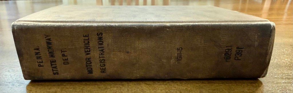 Pennsylvania, among many other states, kept track of vehicle owner and operator information early in the 20th century. I started searching for these historic publications at state agencies and quickly realized that much of the information is in private collections, divided among libraries, or otherwise lost to time. I had to decide early on in my research process how I’d like to focus my study. I chose to seek out the registration covering Pennsylvania’s “porcelain years” – the years that the state of PA issued passenger license plates made in porcelain enamel. PA’s first statewide issue was in 1906, and the last in 1915. I learned that Pennsylvania issued the registration information on a monthly basis, in the form of a booklet that detailed the registration number, the owners name, address, and town. I am still on the hunt for several full years of registrations, and other assorted months. I’ll detail below what I currently have – and if you have information or know where I can find it, please contact me! I aim to photograph all registration numbers and registrants from 1906 through 1915, and would like to make that info publicly available – so that collectors could easily find the history of their license plates!